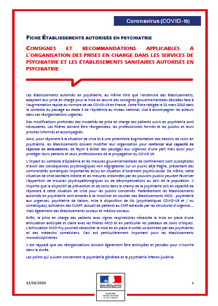 Covid-19 – Etablissements autorisés en psychiatrie – Stade 3 (22 mars)