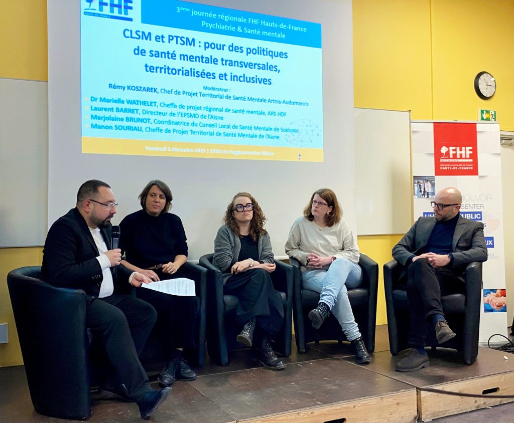 Modéré par Rémy KOSZAREK, Chef de Projet Territorial de Santé Mentale Artois Audomarois, il réunissait Dr Marielle WATHELET, Cheffe de projet régional de santé mentale de l’ARS Hauts-de-France, François CAPLIER, Directeur délégué de l’EPSM de l’agglomération lilloise, Marjolaine BRUNOT, Coordinatrice du Conseil Local de Santé Mentale de Soissons et Manon SOURIAU, Cheffe de Projet Territorial de Santé Mentale de l’Aisne.