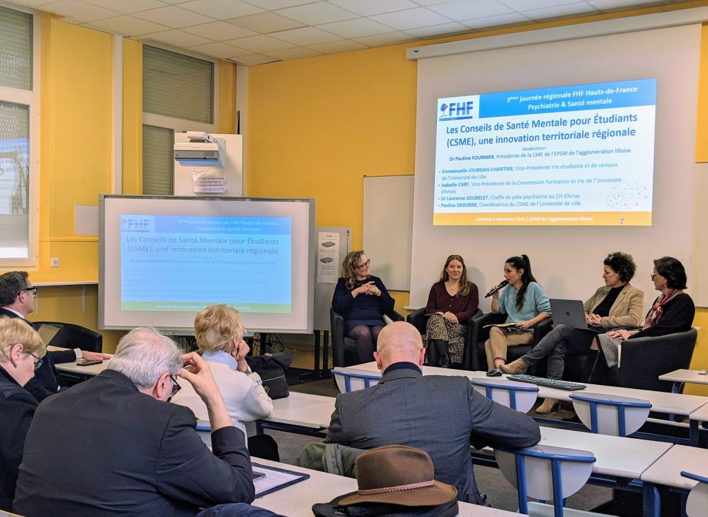Avec pour modératrice Dr Pauline FOURNIER, Présidente de la CME de l’EPSM de l’agglomération lilloise, cette table ronde a fait dialoguer Emmanuelle JOURDAN-CHARTIER, Vice-Présidente Vie étudiante et de campus de l’Université de Lille, Isabelle CABY, Vice-Présidente Formation et Vie universitaire de l’Université d’Artois, Dr Laurence SOUBELET, Cheffe du pôle psychiatrie du CH Arras et Pauline DEGORRE, Coordinatrice du CSME de l’Université de Lille.